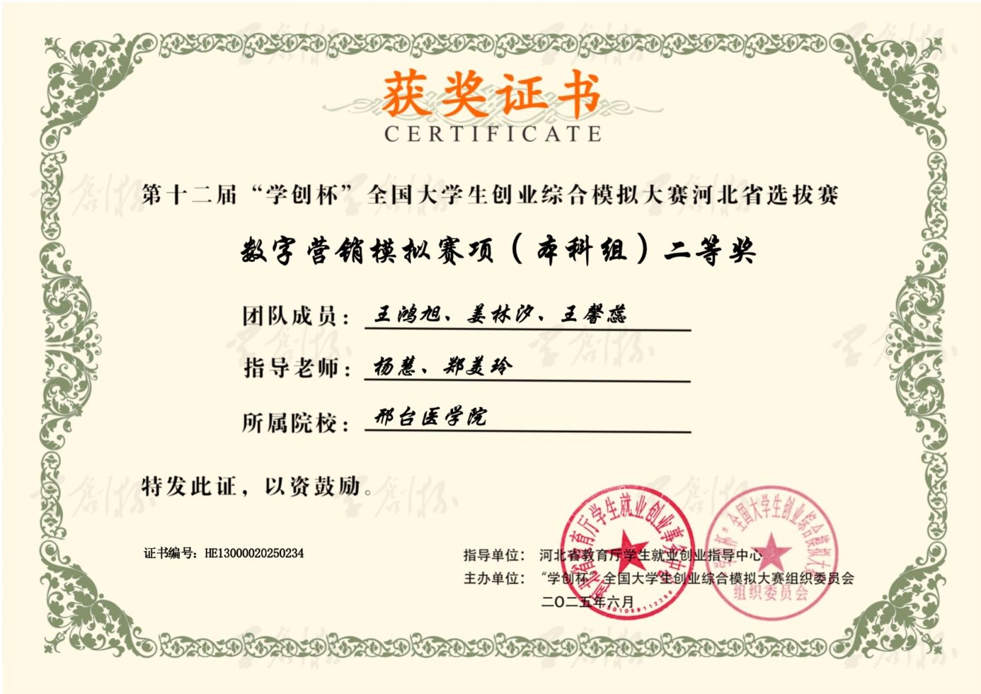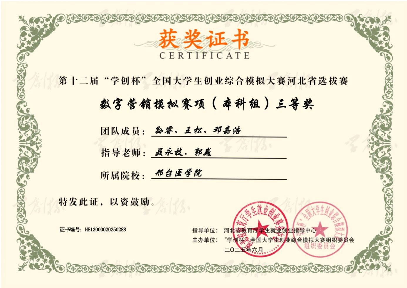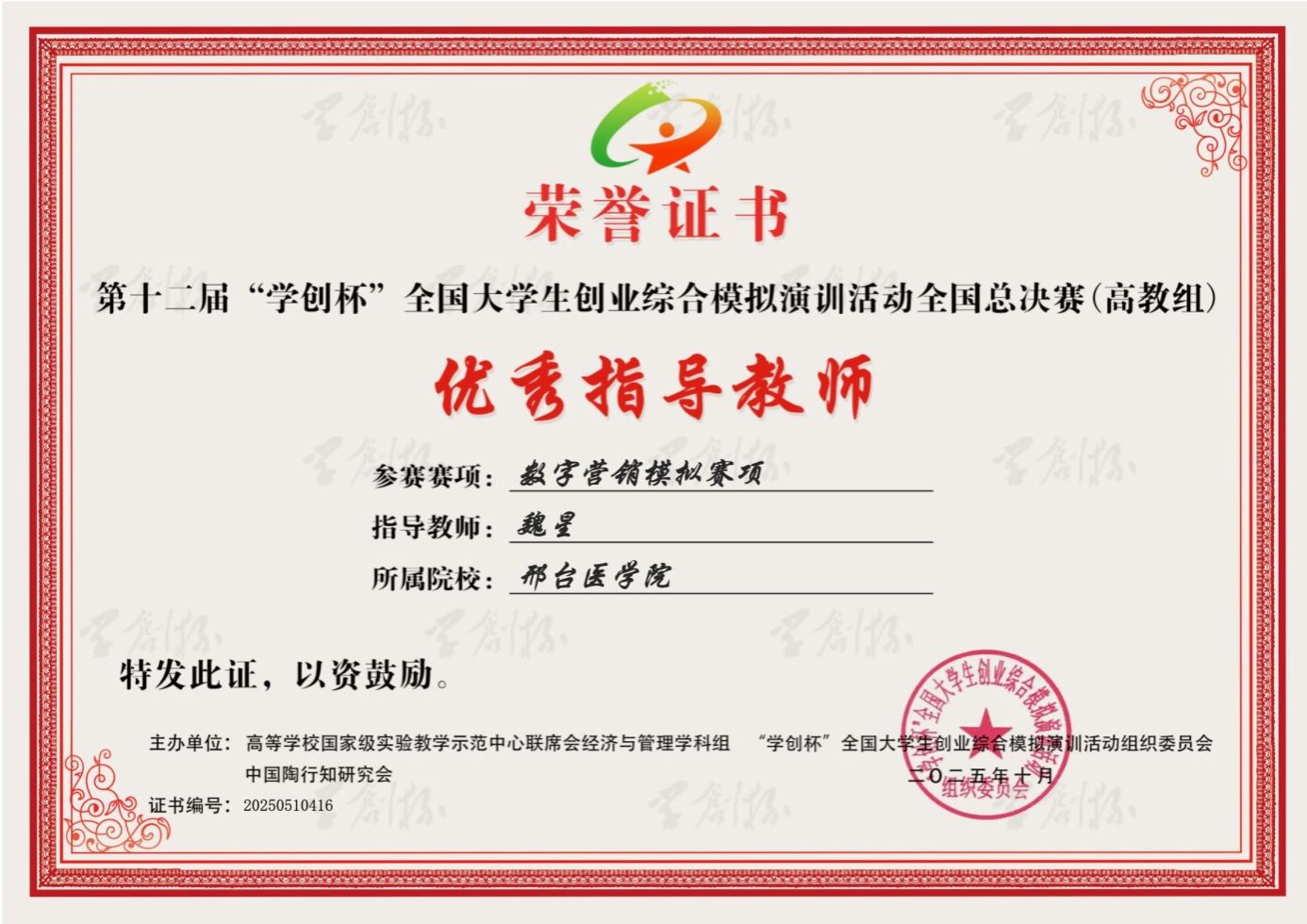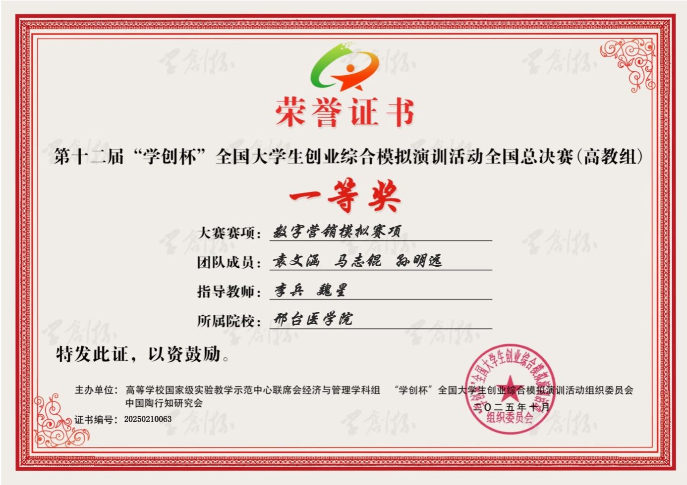 大赛作为全国创业类最具影响力的赛事之一,自2025年3月启动以来,参赛院校达到1500多所,队伍数量超过10万支,进入到全国总决赛的高教组参赛院校221所,队伍287支,师生数量1000余人。我校高度重视此次赛事,招生就业处与就业指导教研室同步启动校内选拔工作,经过系、校选拔赛,最终遴选3支本科数字营销模拟赛道团队与3支本科创业综合模拟赛道团队跻身省赛。备赛期间,各团队利用课余时间刻苦训练,在指导老师悉心指导下精研规则、分析数据、打磨方案,历经省赛半决赛、省赛决赛等多轮比拼,凭借扎实功底在省赛中取得优异成绩,1支团队获省赛一等奖,3支团队获省赛二等奖,2支团队获省赛三等奖。获省赛一等奖团队成功晋级全国半决赛、决赛,最终勇获国赛一等奖,2名指导教师获优秀指导教师。